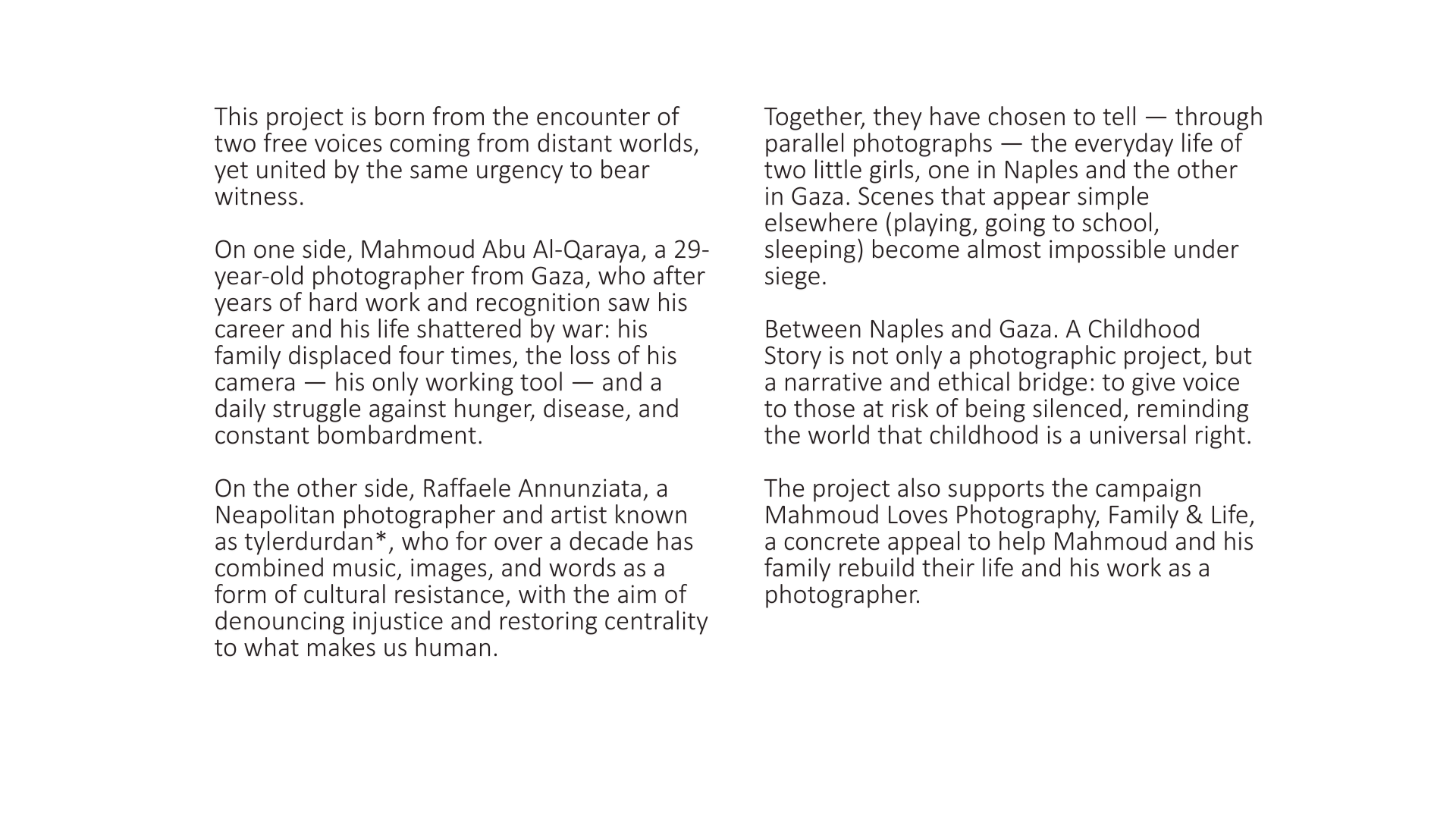 Between Naples and Gaza. A Childhood Story is not only a photographic project, but a narrative and ethical bridge: to give voice to those at risk of being silenced, reminding the world that childhood is a universal right.